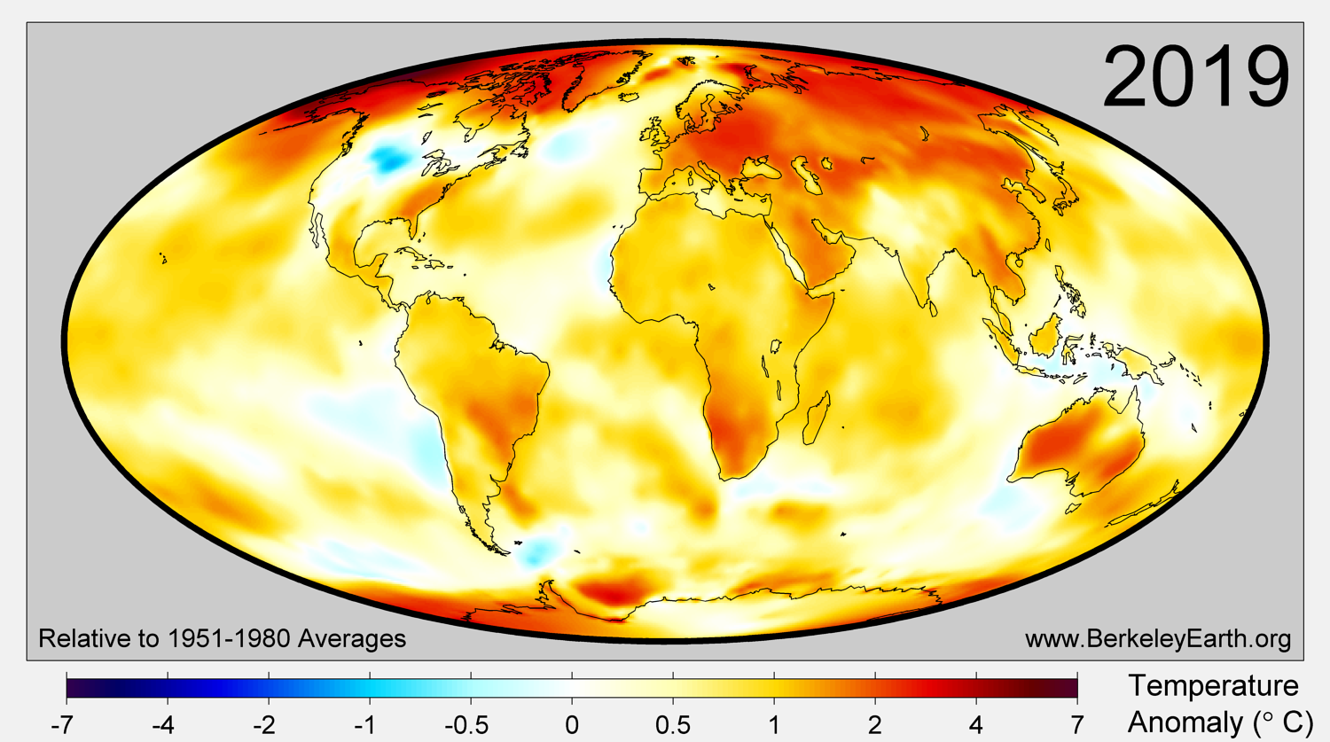 In the map shown – taken from the Berkeley Earth global temperature report – we see the global distribution of temperature changes in 2019 relative to the period 1951 – 1980.7 This period of 1951 to 1980 is similar to the period global average time-series shown in the section above.