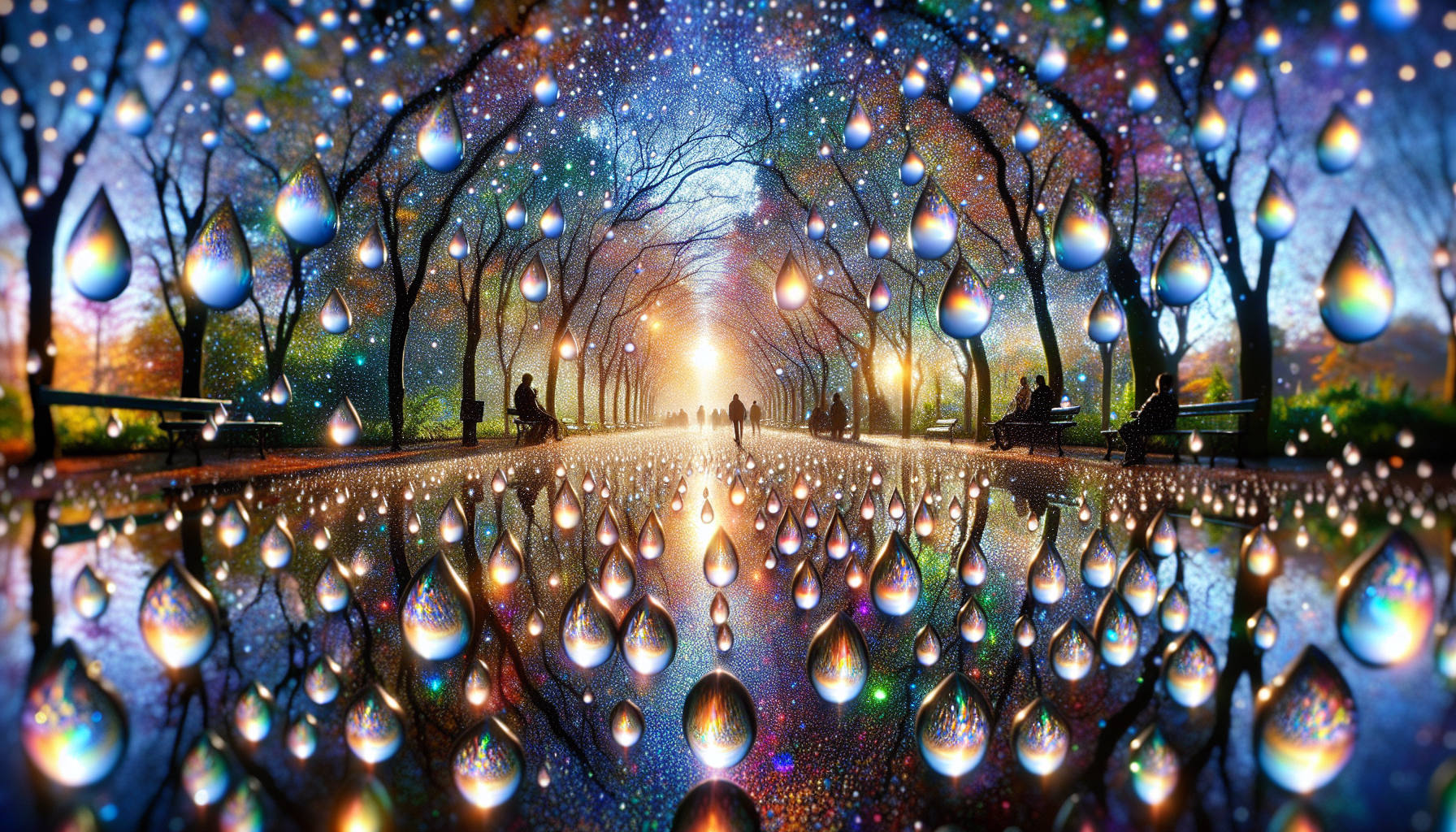 Now picture those possibilities as countless luminous raindrops suspended in the air. Each refracts the world around it — sunlight, shadow, scent, time. They hover in infinite patience, awaiting only the gentle act of attention.