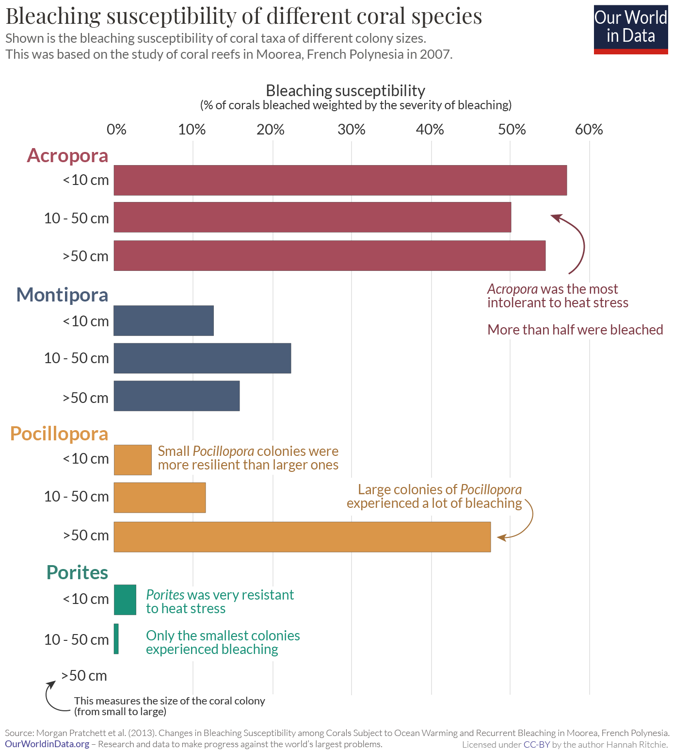 In a study in Moorea in French Polynesia, researchers looked at how different species of coral were affected in a mass bleaching event in 2007. They studied four common corals – Acropora, Montipora, Pocillopra and Porites – and looked at how badly each of them was bleached. This ‘bleaching susceptibility’ was measured as the percentage of corals that were bleached weighted by how severe the bleaching was. The results are shown in the chart.