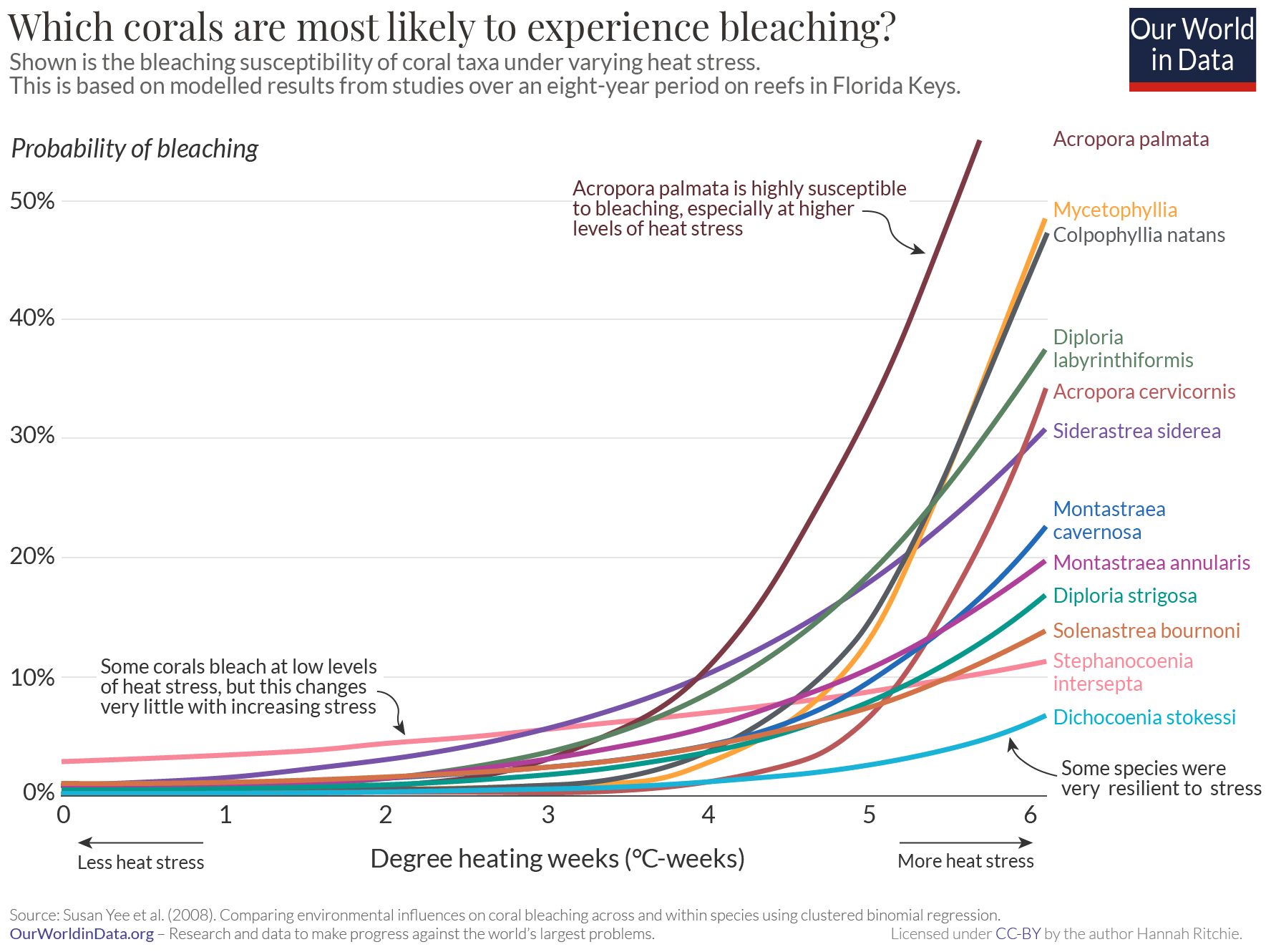 This variability in response to heat stress is not unique to these particular coral taxa. A number of studies have shown the same across a range of coral taxa and reefs across the world. One study looked at the bleaching susceptibility of coral taxa in the Florida Keys over the course of eight years. In the chart, we see how the probability of coral bleaching changed with increasing heat stress. Heat stress is measured using a metric called ‘degree heating weeks’ – more degree heating weeks equals more heat stress.