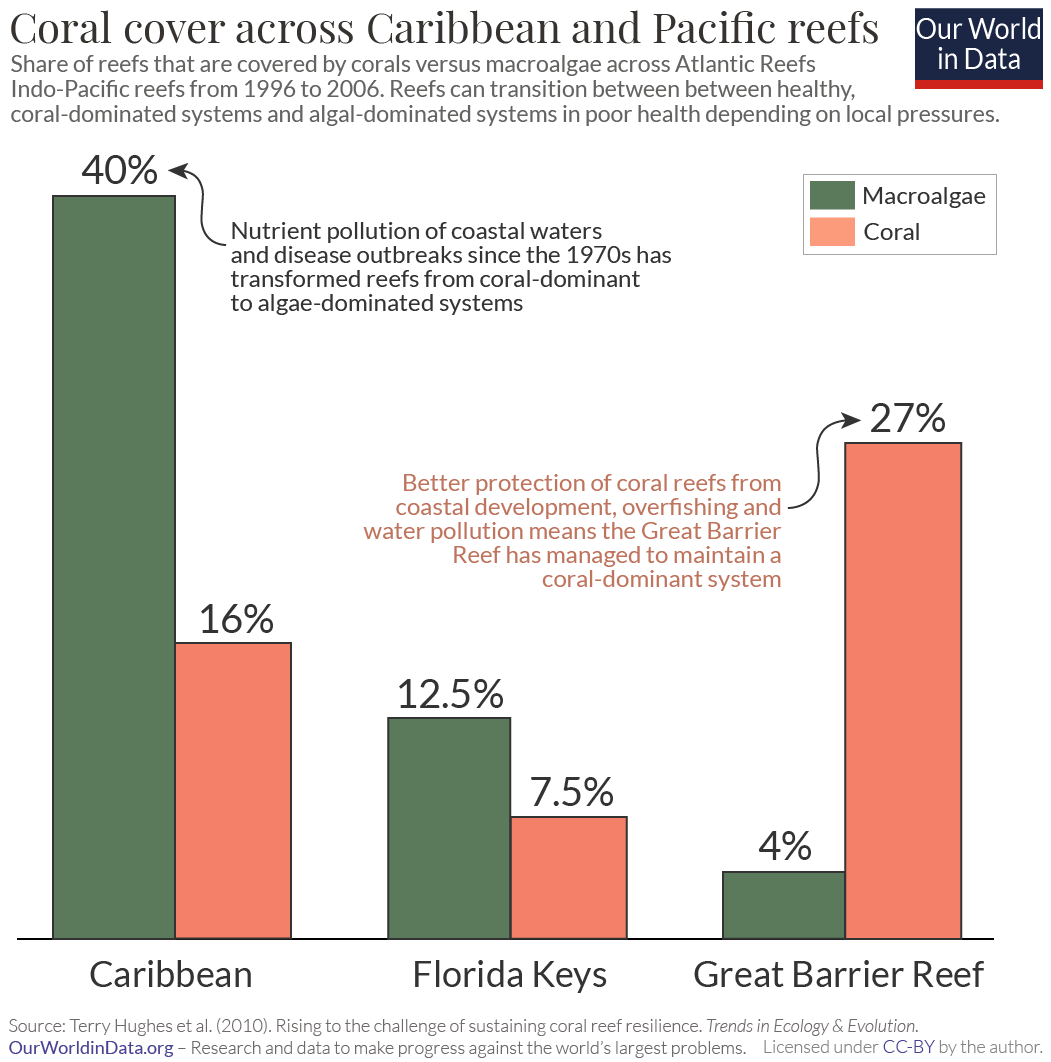 This degradation of coral ecosystems that we saw in the Caribbean is reflected in other regions of the world, but often not to the same extent. Caribbean reefs have seen the greatest decline over the last 50 years, and have fundamentally changed from ecosystems of coral to ones dominated by algae.