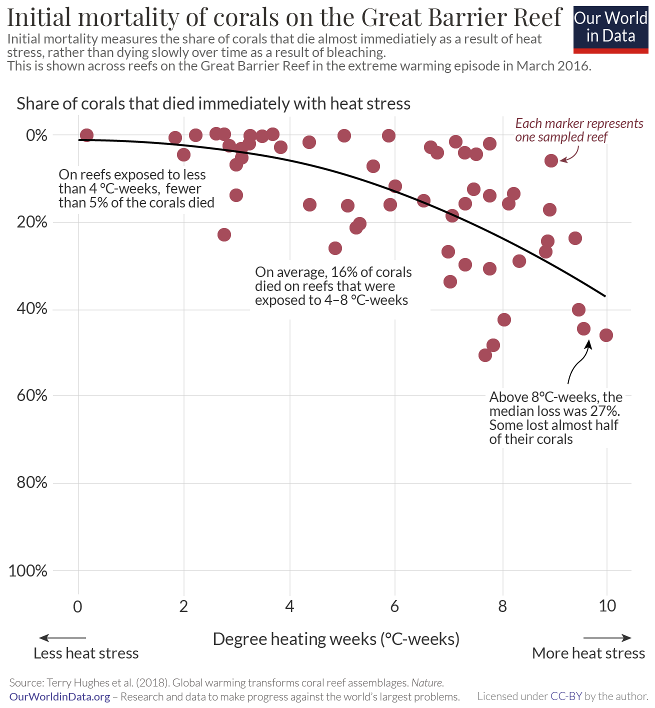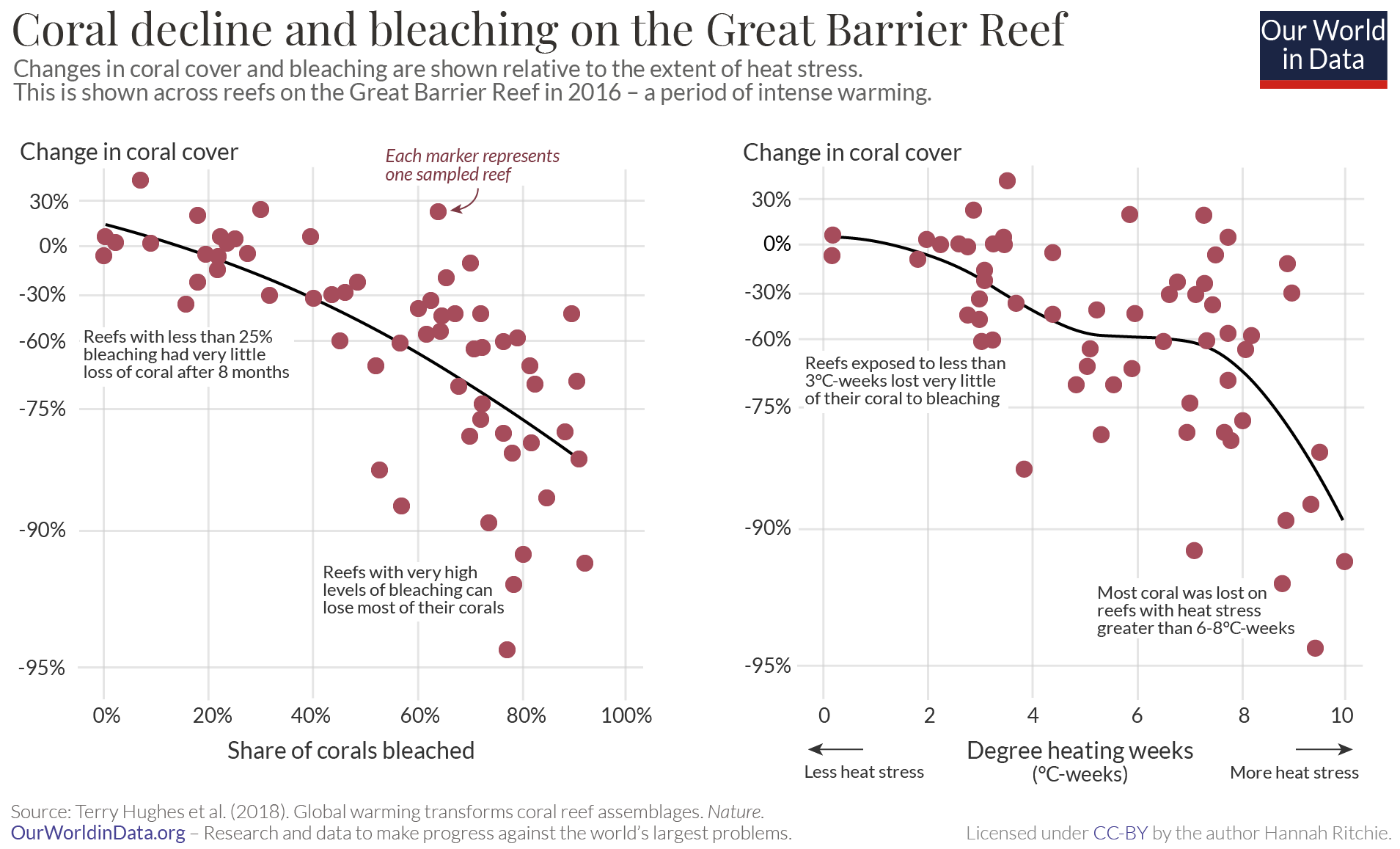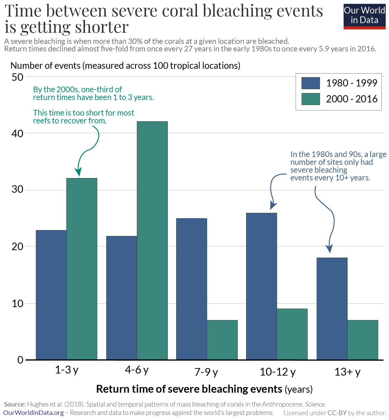 We see in the charts that the Indian Ocean and Australasia have seen the strongest rise in bleaching over time. In the 1980s, bleaching events were rare. By now it’s rare that there would be a bleaching-free year. This is even true of severe mass bleaching events.