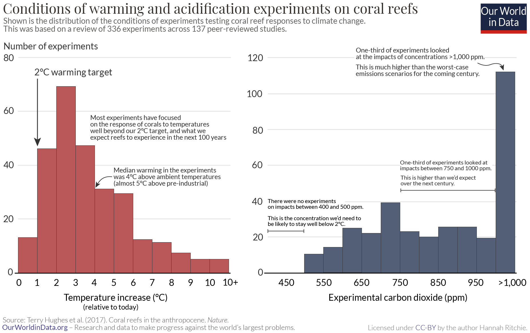 Hughes et al. (2017) reviewed 336 experiments across 137 studies and found none that assessed the impacts of 400 – 500 ppm, the concentrations that we’d expect coral reefs to experience in the coming century. The lowest concentrations started at 500 ppm: one-third of experiments ranged from 500 to 750 ppm. Another third ranged from 750 to 1000 ppm, and the remaining third were over 1,000 ppm.