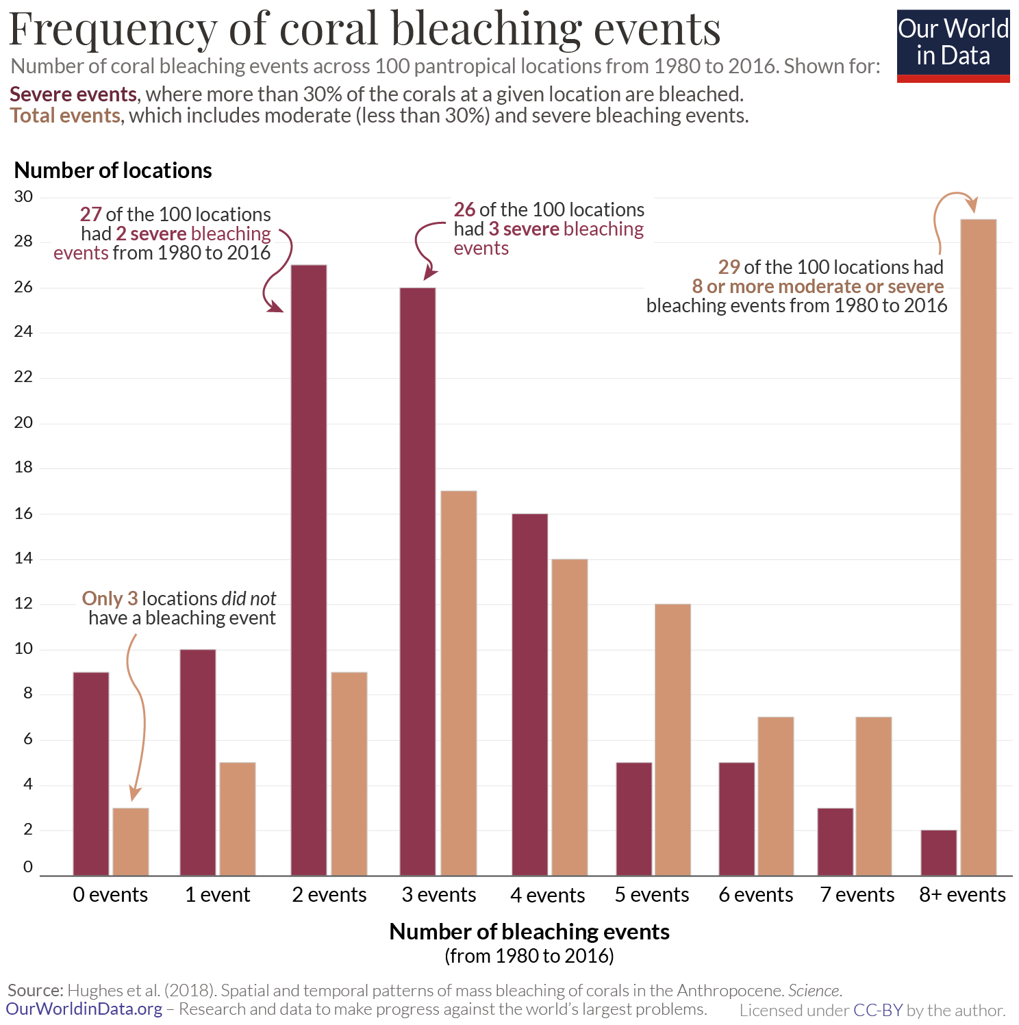 In a study published in Science, Terry Hughes and colleagues tracked the frequency of coral bleaching events across 100 pantropical locations from 1980 to 2016. This included all of the key coral hotspots spanning 54 countries, from the West Pacific, to the Atlantic, the Indian Ocean to the Great Barrier Reef in Australasia.
