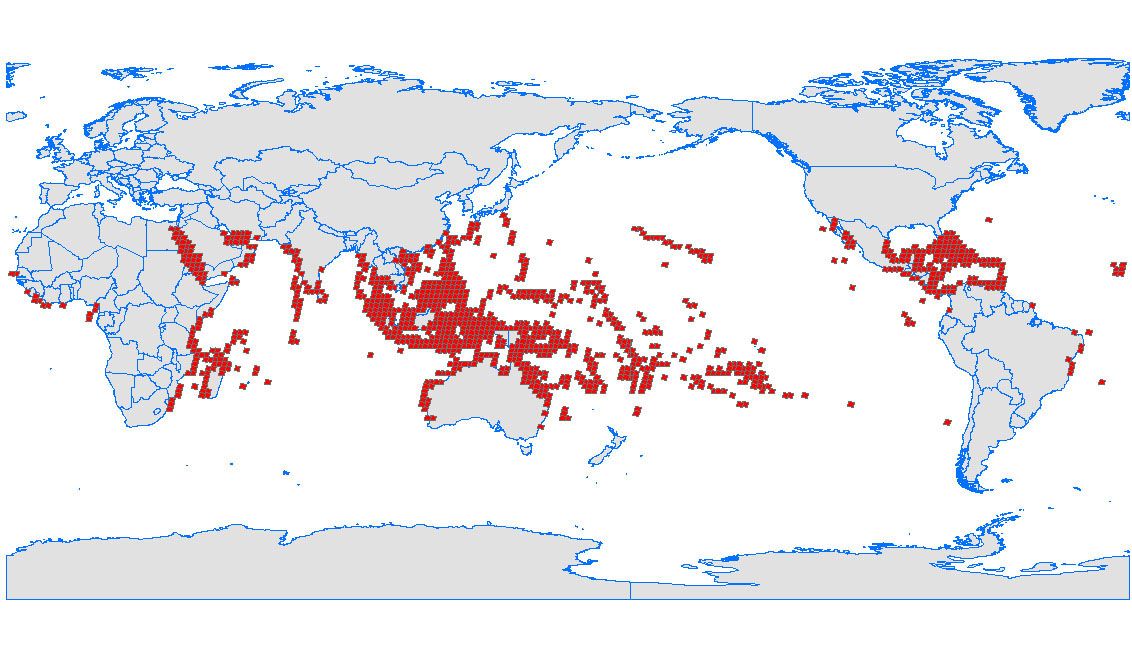 The distribution of the world’s warm-water coral reefs is shown in the map. Each box represents a gridded location where NASA collected high-resolution imaging and data on the ocean’s corals as part of its Millennium Coral Reef Mapping Project.