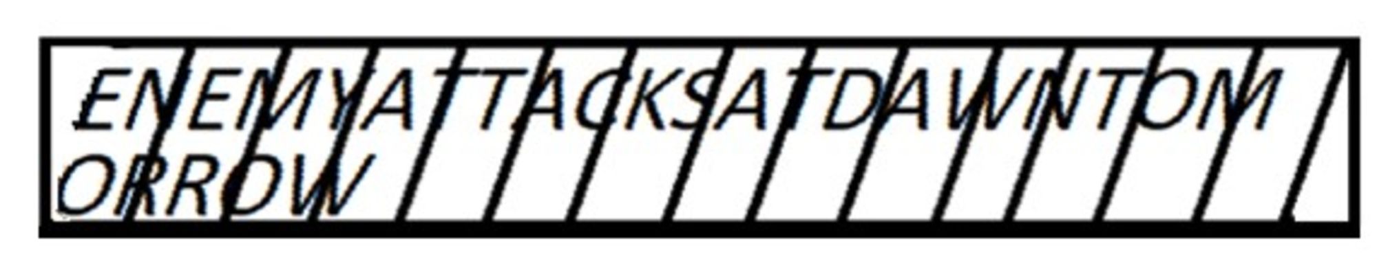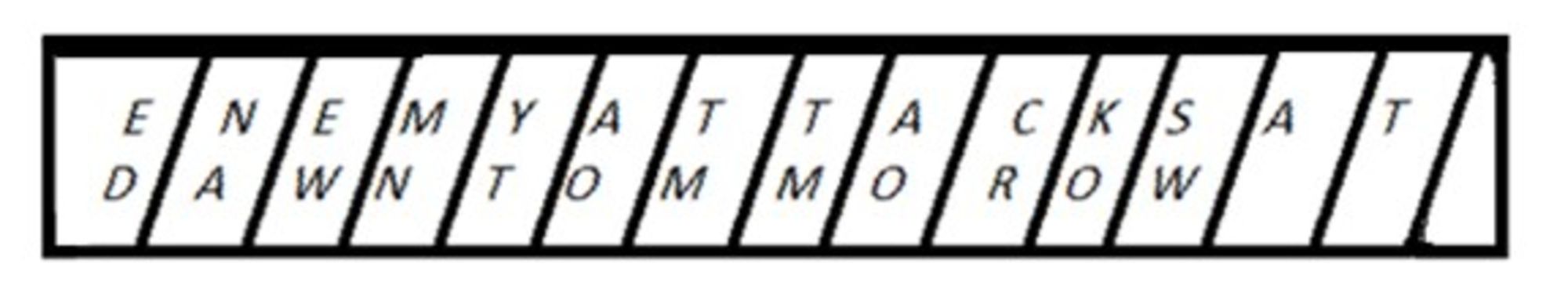 What Plutarch and Aulus Gellius (following Plutarch) describe is a simple but ingenious device for sending secret messages, whereby only 2 scytalae (literally ‘sticks’) of the same size, and a piece of parchment or papyrus were needed. When a Spartan commander was going to war, the ephors would take two scytalae. They gave one to the commander to take with him and kept the other one in Sparta. The following example shows how this worked according to Plutarch’s and Aulus Gellius’ descriptions, and how the strip of writing material may have looked during the subsequent steps in the process. For this example, the text ‘Enemy attacks at Dawn Tomorrow’ will be used.