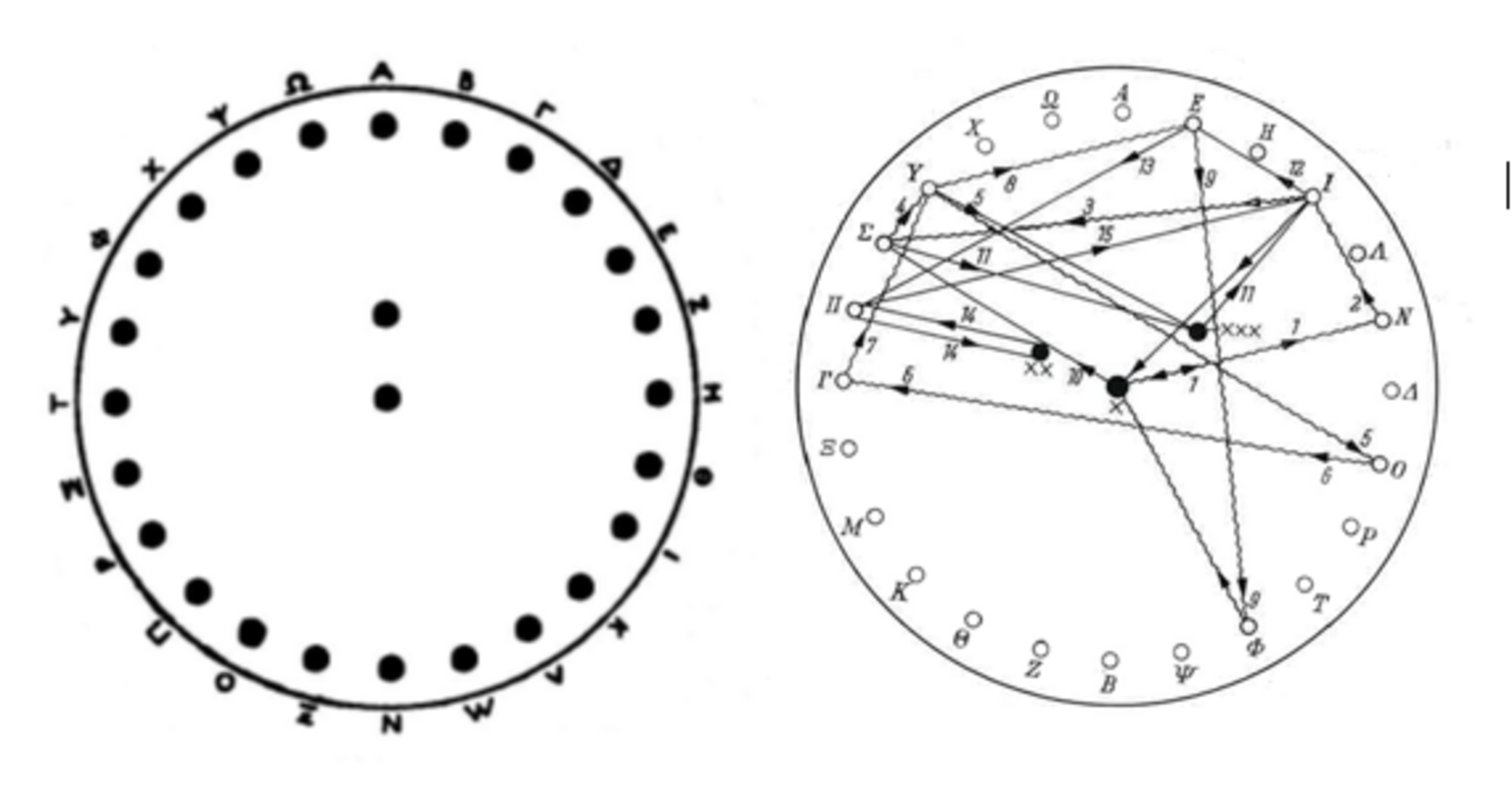 Figure 1 shows two possible reconstructions show what this disk might have looked like. Diels’ suggestion( Figure 1; left) in which the letters alpha to omega are written clockwise in their normal order at the edge of the disk. Diels incorrectly describes this as a reconstruction of an astragalus while it clearly represents Aeneas Tacticus’ wooden disk.[20] Figure 1 (right) shows Welskopf’s reconstruction in which the first four letters – alpha, beta, gamma, and delta – can be found at the top, bottom, and left and right side of the disk as on a compass where north, south, east, and west are pointed out. The rest of the letters can be found right opposite each other on the disk starting at the top with a letter of the right side, then a letter on the left side and so on.[21] Yet, it is more plausible that the letters were ‘written’ in alphabetical order to avoid making this already complex method yet more complex again.