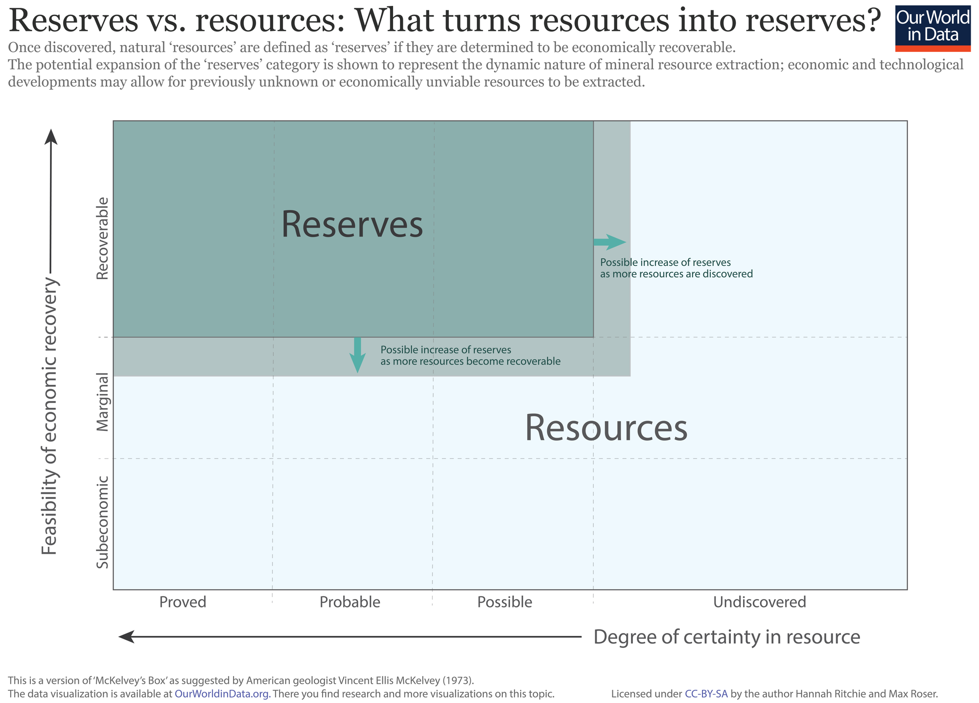 Whilst the original source of this concept – the American geologist Vincent McKelvey – visualized it as a static box, this transition between resources and reserve classifications is dynamic. As we discover previously unknown resources, and develop improved extraction technologies for economic recovery, this reserves box can grow with time (or shrink as we consume them).