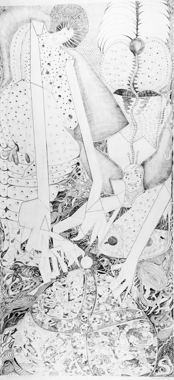 This piece is a study for a trilogy of paintings on genocide. The three pieces combined explore the economic motivation towards genocide. The factors include race, land acquisition, oil, and other financially profitable businesses for the very wealthy – the people in power. In this investigation, I have depicted Yasuo Fukuda, Tony Blair, Paul Martin, Gerald Schroder, Silvio Berlusconi, George W. Bush, Jacques Chirac, Vladimir Putin, and Jose Barroso. They are depicted as half-machine digging up the different genocides contained within a human breast. During the Rwanda genocide, many countries had a policy of non-admittance to other countries thus trapping those who wanted out and obliterating most of the population. The drawing depicts various brutal ways in which the Hutus and the Tutsis obliterated each other. The economically powerful in this scene are Yasuo Fukuda, Tony Blair, and Paul Martin.