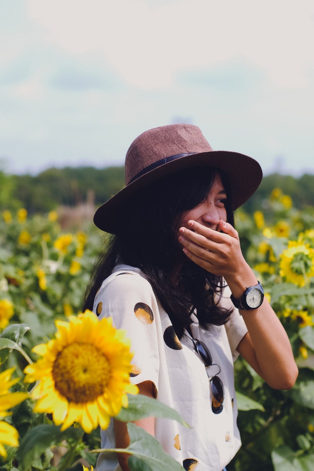 Sophia's laughter trickled through the sunflower field, a carefree melody that danced amongst the towering blooms. It was an infectious sound, one that seemed to encourage even the sunflowers to sway a bit more merrily under the clear blue sky. As the sunlight draped her in its warm embrace, she paused, a single sunflower catching her eye. It was taller than the rest, its face proudly basking in the sun's glow. Sophia felt an inexplicable kinship with the flower, as if it were an old friend urging her to bask in the simple joys of life.