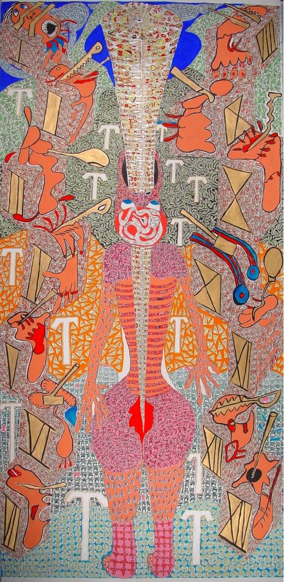 Financial rape and the toxic dump of economics makes us full of despair. We endure pain such as a fractured back, broken or herniated discs. We get arthritis, our organs deteriorate and we are sad and desperate. As a result of foreclosure, eviction, and loss of income, our body deteriorates at a faster pace. The person in the painting has removed her bodily organs and has put them on altars, like a ritual to her. Her plan is to replace the organs in her body so she can start over and make a new beginning.