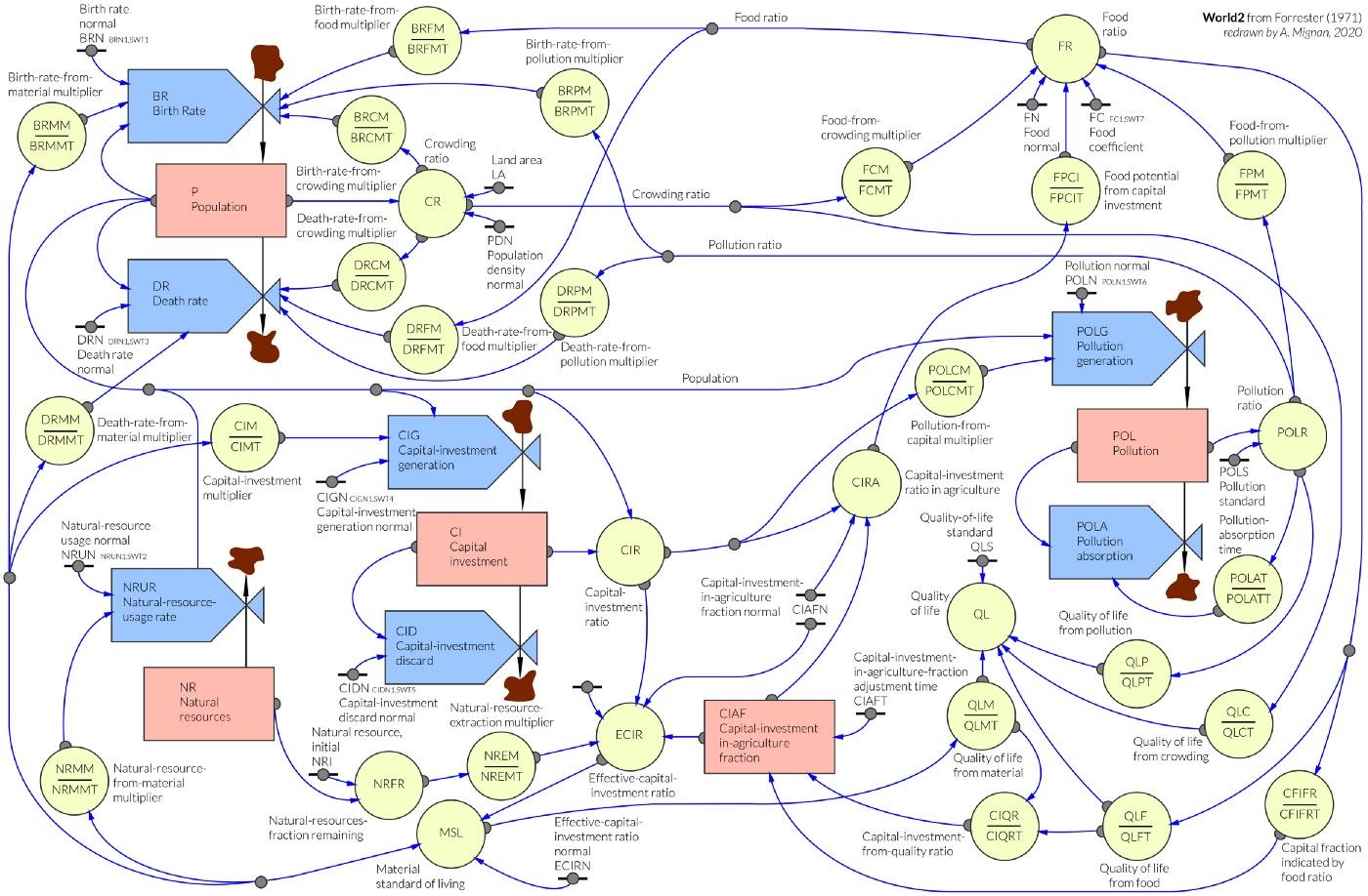 World Dynamics was based on a model called World 2, and was the predecessor for the World 3 model, featured in the book, Limits to Growth in 1972. Basically, the model shows that if you negate one system state impeding growth, you will run into another system state that limits growth. Currently, I'm doing a YouTube series called World Dynamics with Minsky. It is a step-by-step tutorial series on how to build the world 2 model using Minsky.