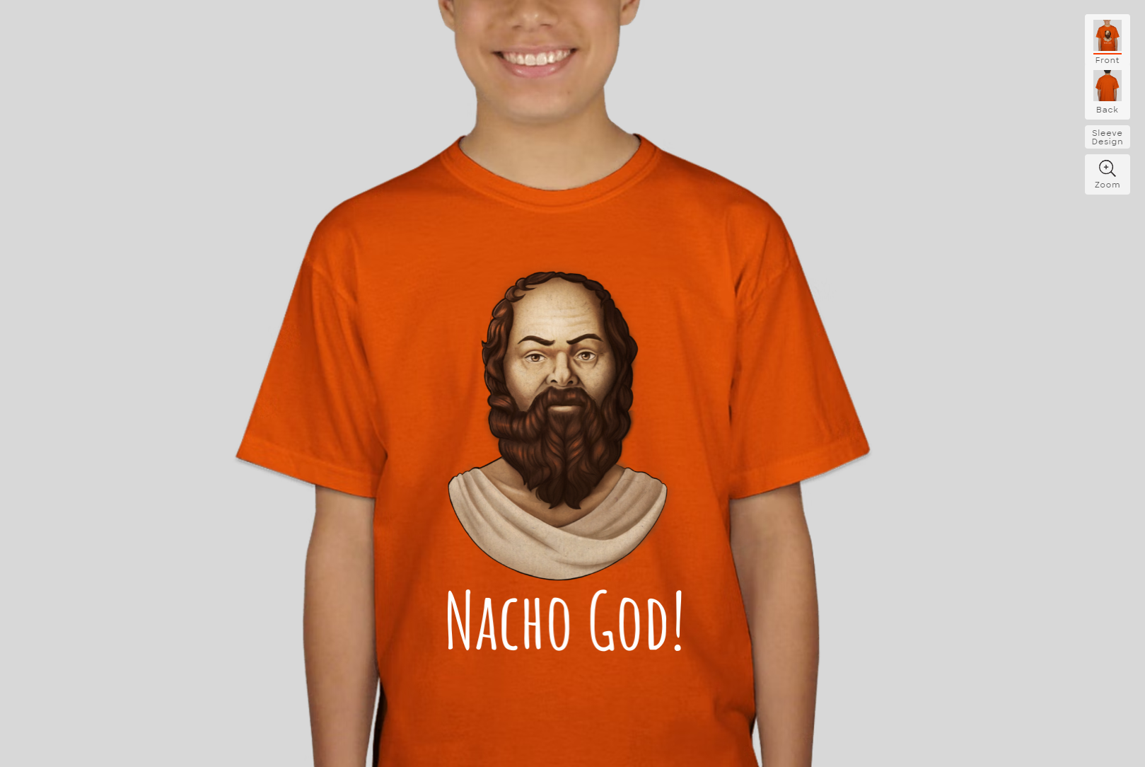 Do you notice the three navigating icons in the top right of the Nacho God T-Shirt? Creating this image took me roughly five minutes. I consulted the Google Oracle (again) and searched for the term T-Shirt Designer online. Lo and behold, https://www.customink.com/ provided the background; I uploaded the Socrates art and provided the text. Now, I think this is a novel use of my time to create the effect I had in mind.
