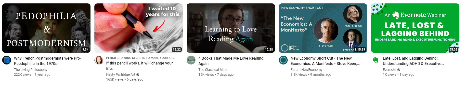 Starting from the far left, if I were socially hyper-sensitive, I would focus on "Pedophilia", whereas "Postmodernism" is the carrier for the algorithm, "Pedophilia" would increase this particular instance of a philosophy video from The Living Philosophy YouTube channel. If you still haven't grasped the point of my far left plea for help, it's because ... ...