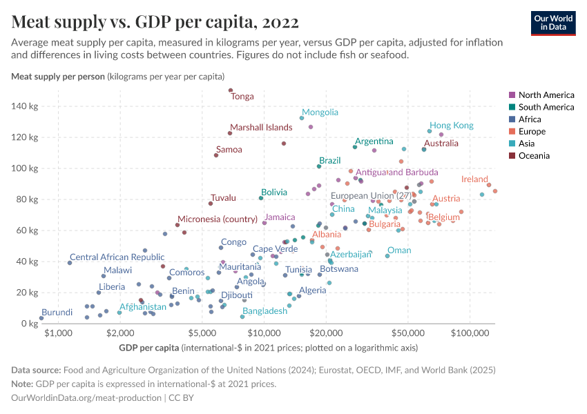 Some people are in favour of a switch to traditional plant-based diets: cereals, legumes, fruits, and vegetables. Because the land use of plant-based diets is smaller than meat-based diets this is definitely a sustainable option; those who adopt such diets have a low environmental footprint. But many people in the world just really like meat and for those that can afford it, it’s a central part of their diet. For many of those who can’t aspire to be able to do so; we see this when we look at how meat consumption rises with income.