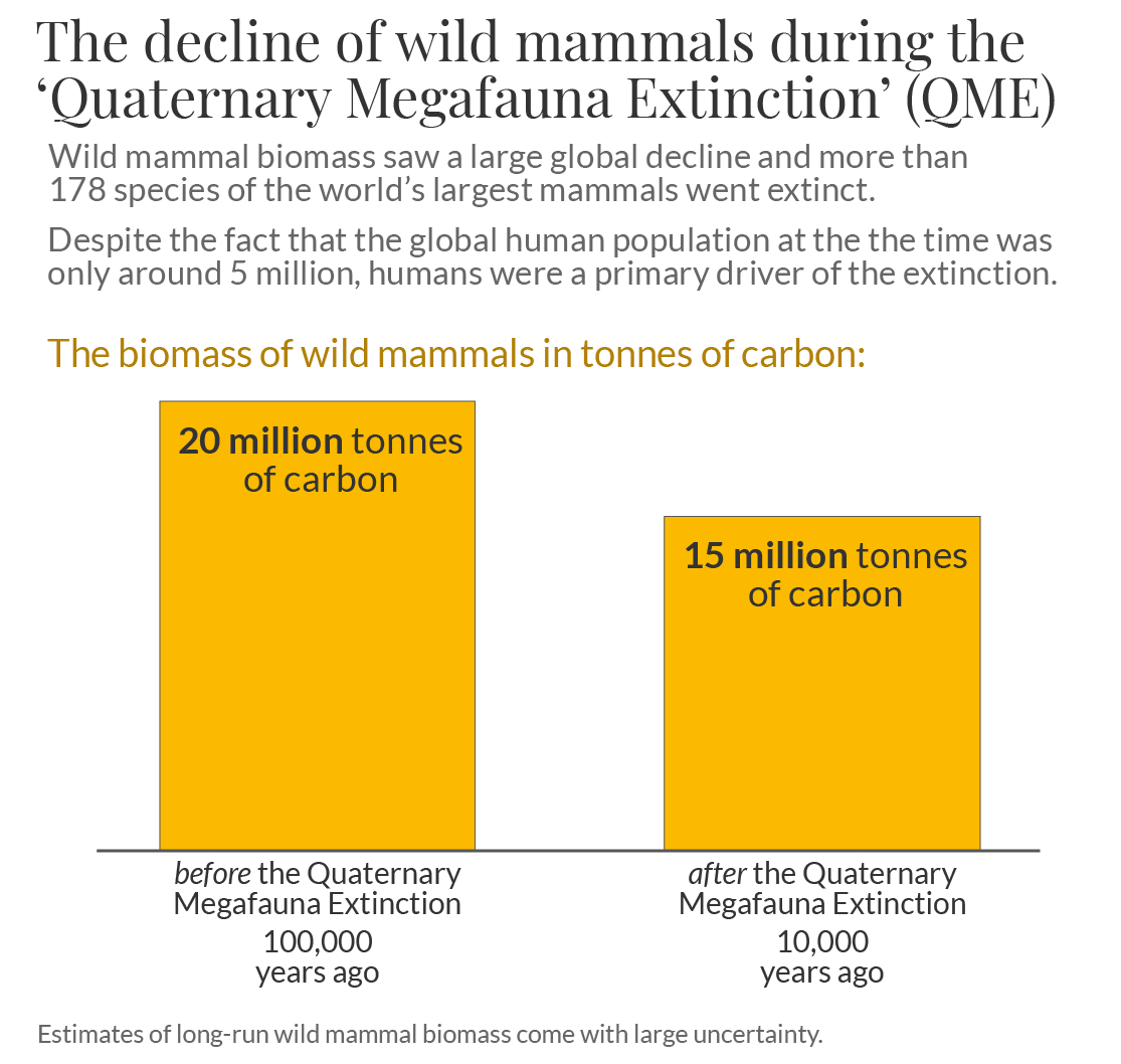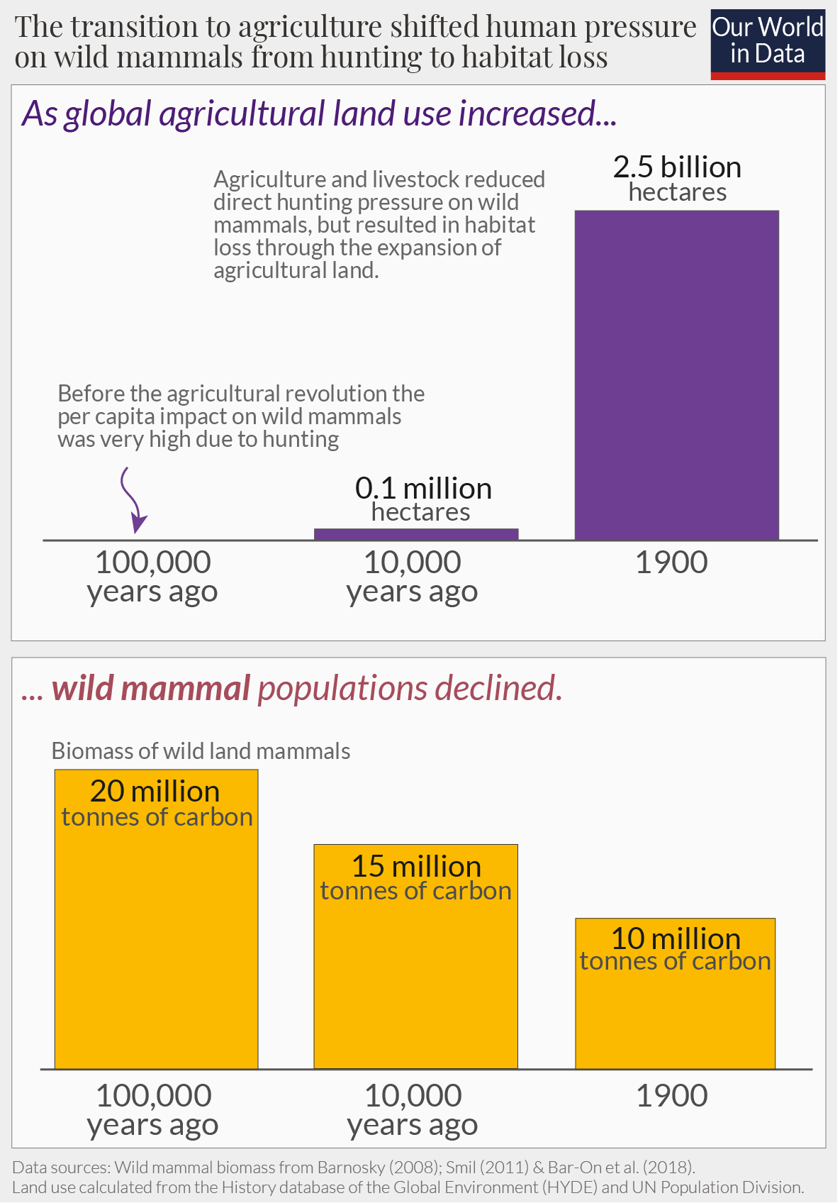We see this change clearly in the bottom panel of the chart: there was a first stage of wild mammal loss through hunting; then another decline through the loss of habitats to farmland.