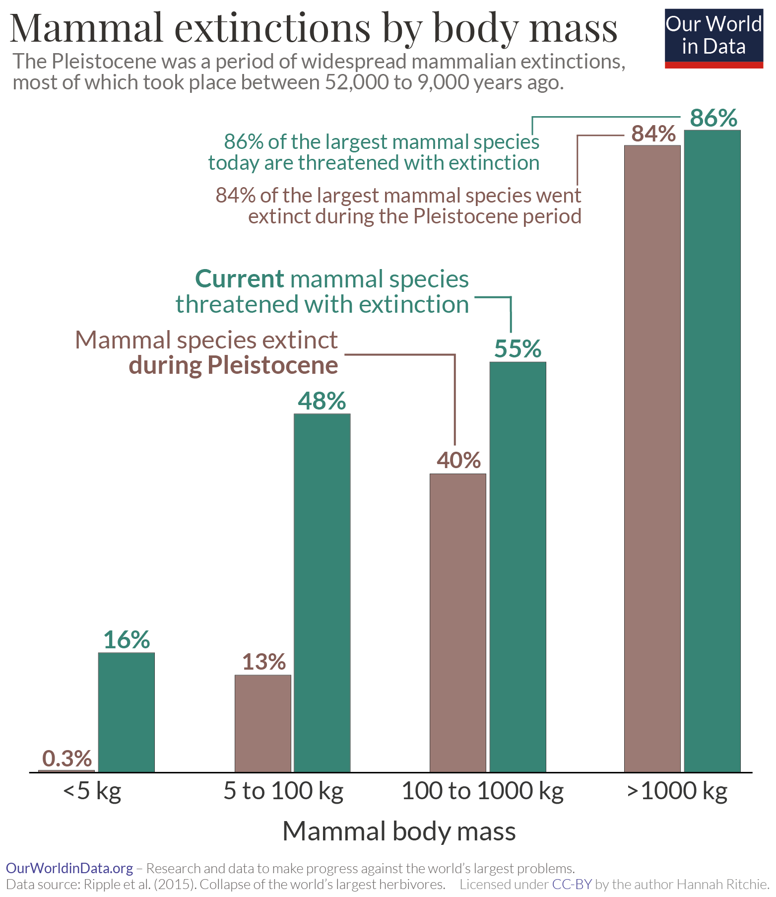 The largest mammals are at the greatest risk of extinction. This has been the case since the arrival of humans, and is still true today.