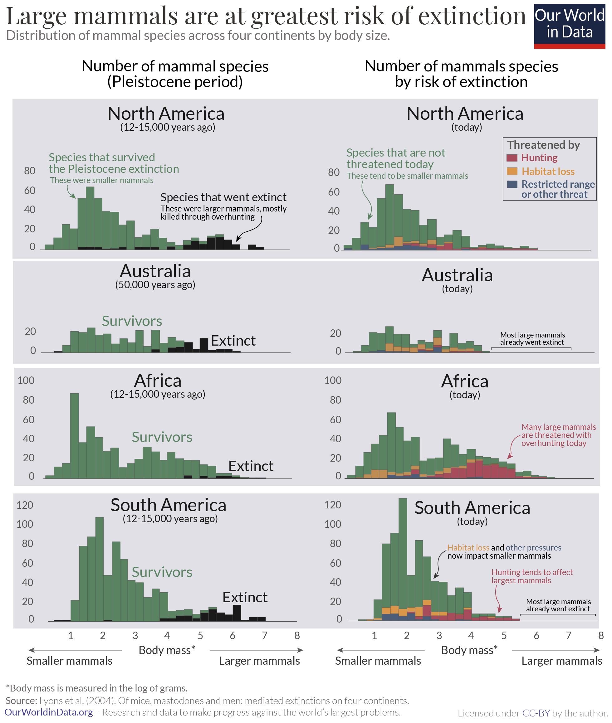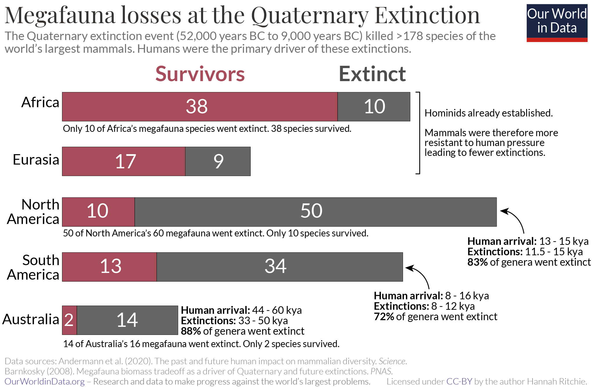Many researchers have grappled with the question of what caused the QME. Most evidence now points towards humans as the primary driver.4 I look at this evidence in much more detail in a related article. Most of this human impact came through hunting. There might also have been smaller local impacts through fire and other changes to natural landscapes. You can trace the timing of mammal extinctions by following human expansion across the world’s continents. When our ancestors arrived in Europe the European megafauna went extinct; when they arrived in North America the mammoths went extinct; then down to South America, the same.