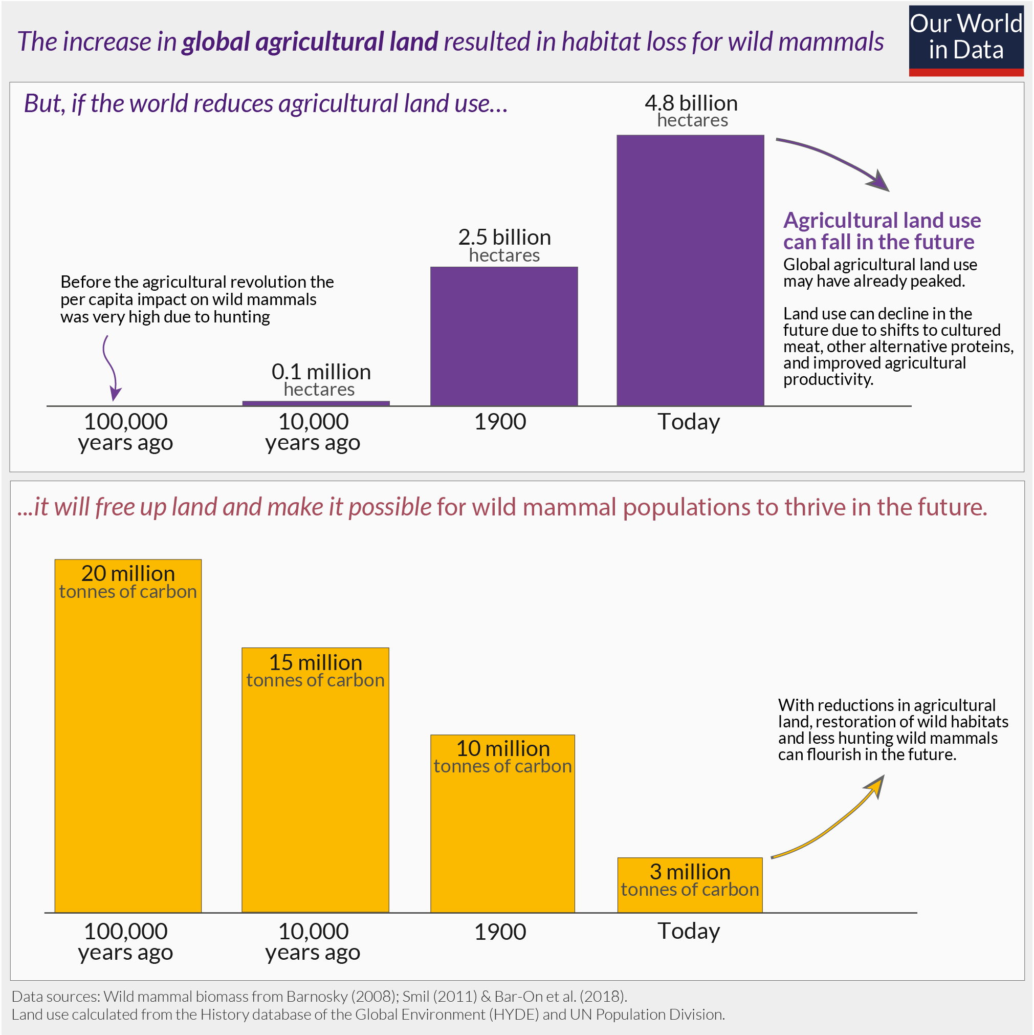 I’ve tried to capture what the future could look like in this final chart. It shows the rise in global agricultural land use over these millennia and the decline in wild biomass that we’ve already seen. But looking to the future, a decline in agricultural land alongside a rise in wild mammals is possible. How can we achieve this?