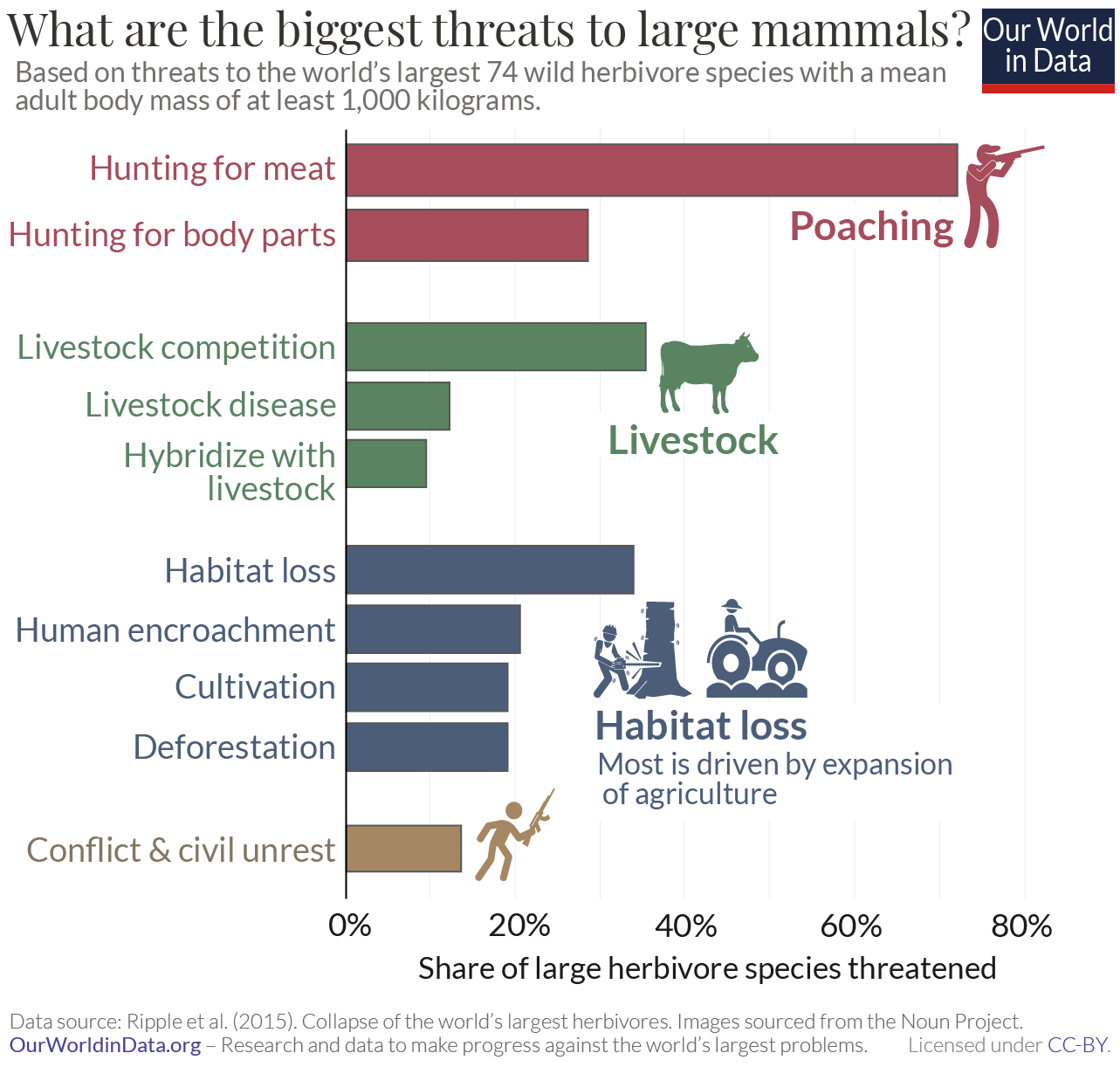 But the alternative of continued growth in livestock consumption is also not sustainable. In the short term, it is saving some wild mammals from hunting. But its environmental costs are high: the expansion of agricultural land is the leading driver of deforestation, it emits large amounts of greenhouse gases, and needs lots of resource inputs.