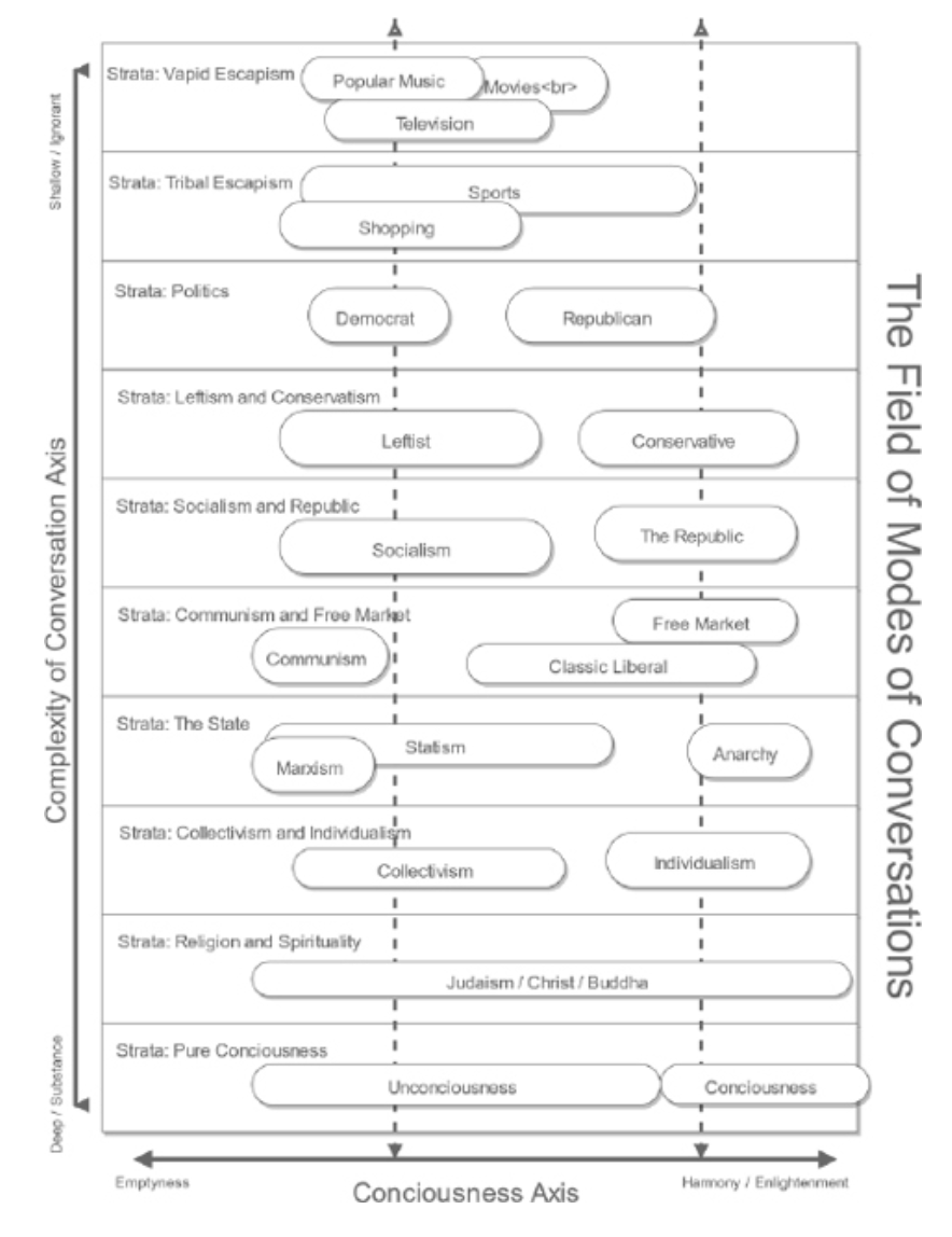 I found Bagot's use of a Tilda (~) to introduce the ten Modes of Conversation to be intriguing. As I read, I form testable judgments by comparing my assumptions as I read (we all do a similar type of thing). The Tilda symbol next to each Strata level suggested to me that the boundaries were fluid, akin to the divisions of the Triune brain, which are not physical barriers in the brain but rather imaginary lines that distinguish one area of the brain from another. Given that I was only a few pages into the book, my speculation was that Sam was attempting to convey this idea. Let's proceed to explore further. Figure 1.1, the first figure in the book, will serve as our starting point.