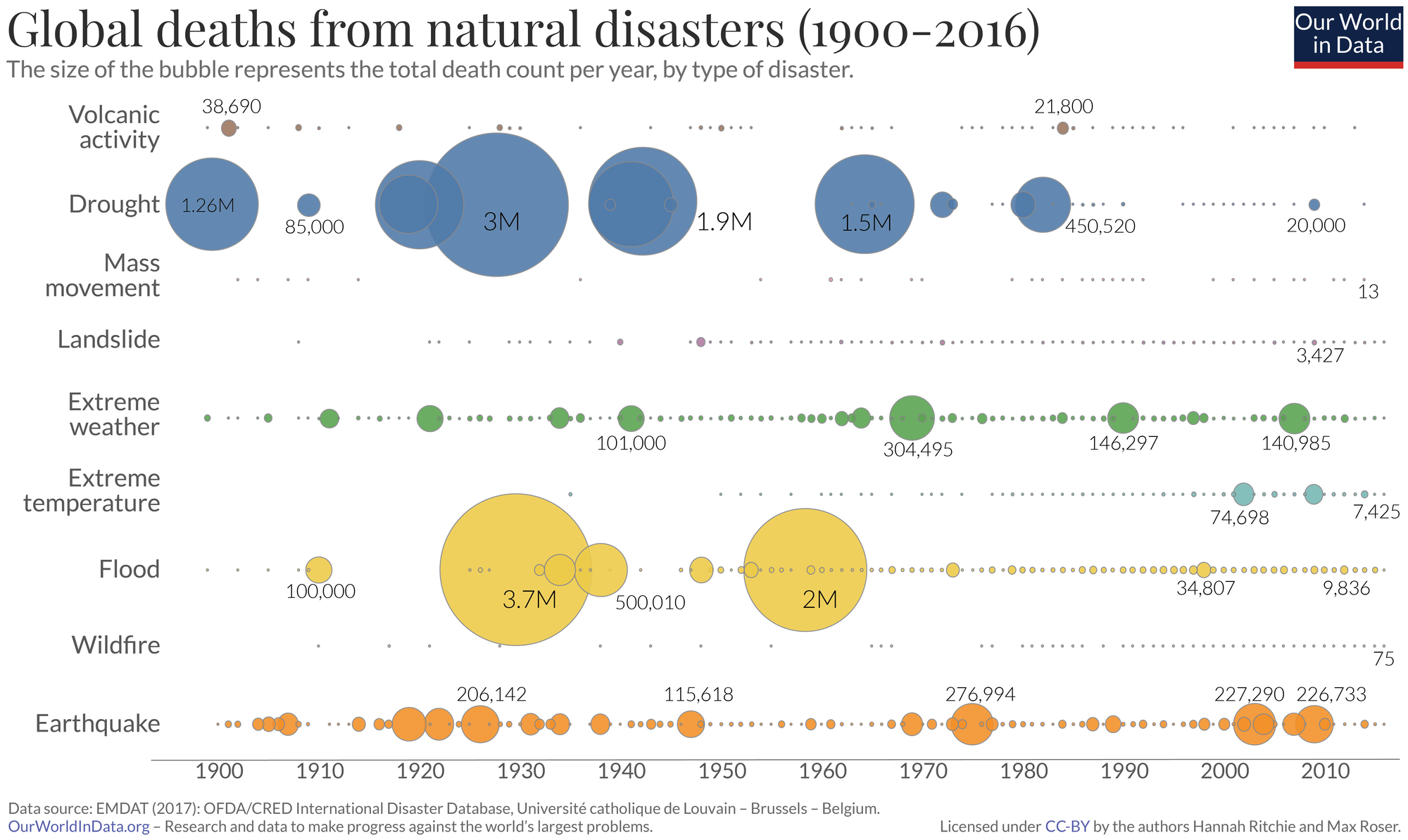 We have also visualized this data in a single chart, where the number of deaths from each disaster type is represented by the bubble size. Once again, the devastating impacts of drought, flood and earthquake events of the past become clear. But what we also observe is the significant decline in deaths from almost all types of disasters with the exception of earthquakes and extreme weather.