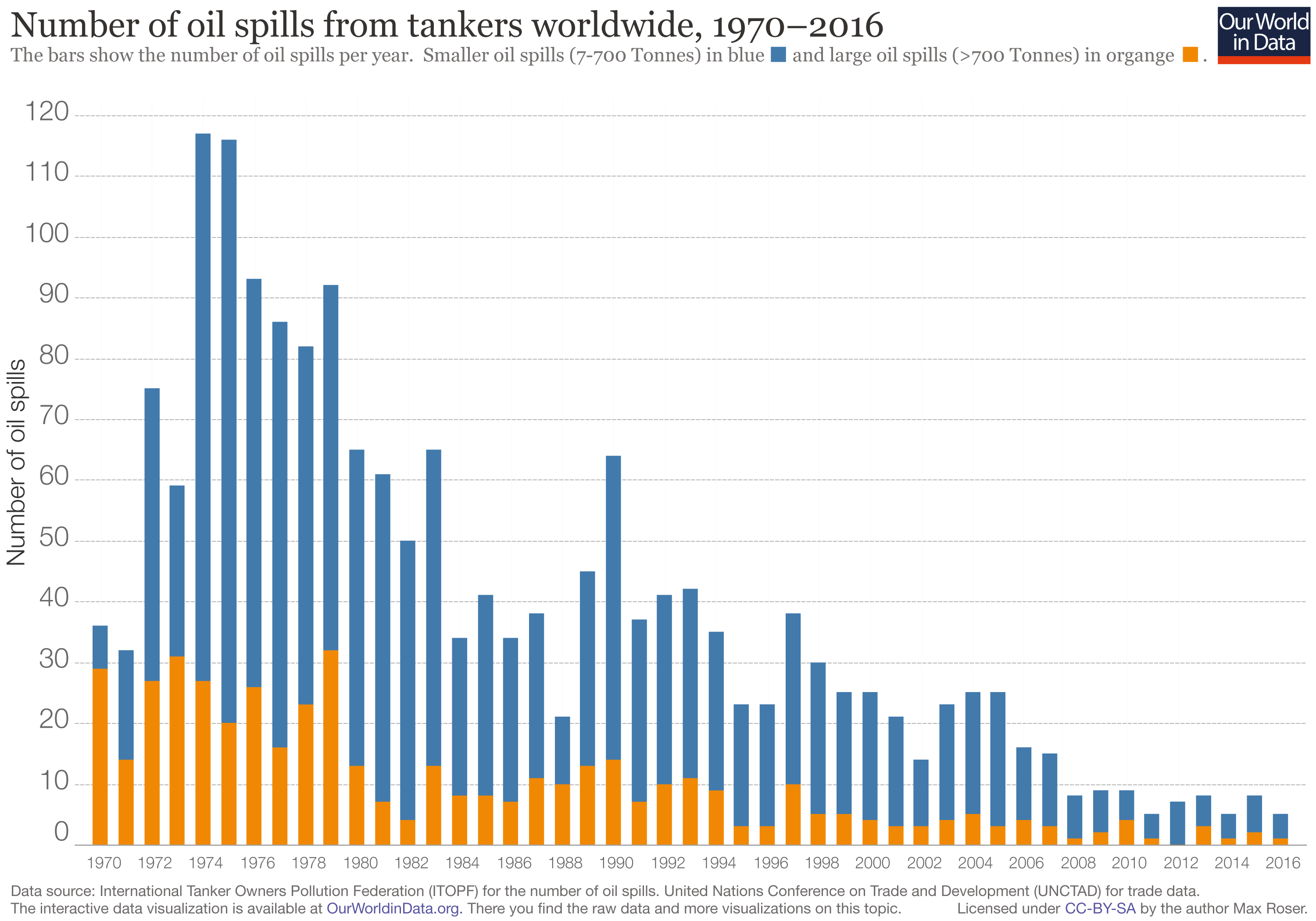 While in the 1970s there were 24.5 large (> 700 tonnes) oil spills per year, in the 2010s the average number of large oil spills decreased to 1.7 oil spills per year.