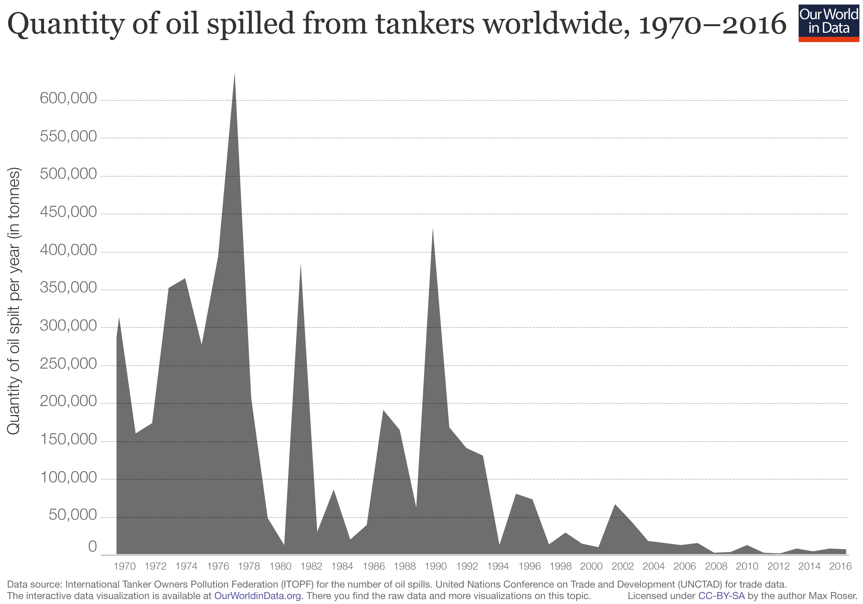 Over the past four and half decades – the time for which we have data – oil spills from tankers decreased very substantially.