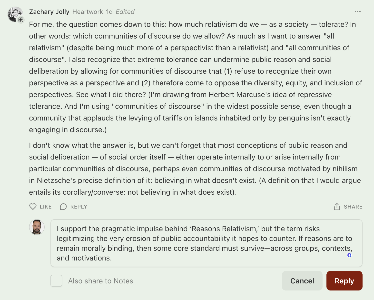 I am grateful for Zackary Jolly’s provocation. It deepens the inquiry. It sharpens the stakes. And to my imagined friend, Relativus, I offer not scorn but warning: