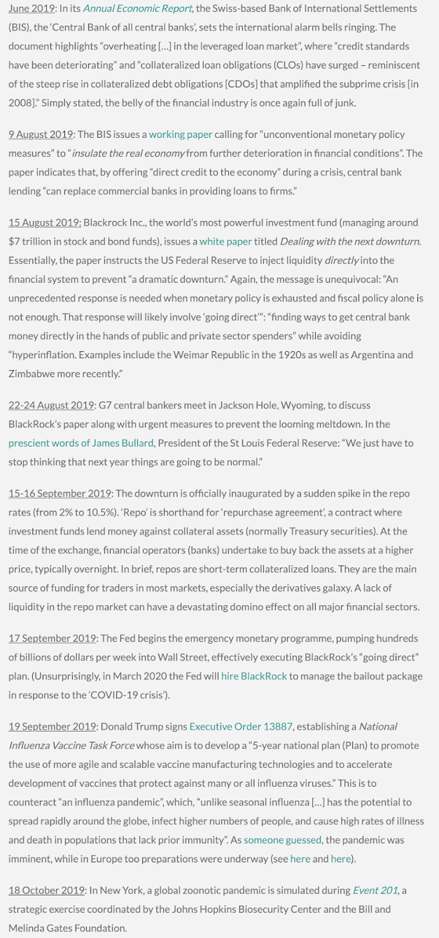 The valuable part of this article is the timeline at the beginning. It goes from September 2019 to March 2020. This was the run-up. We are now reaping the harvest of what was planted by the 0.01%.