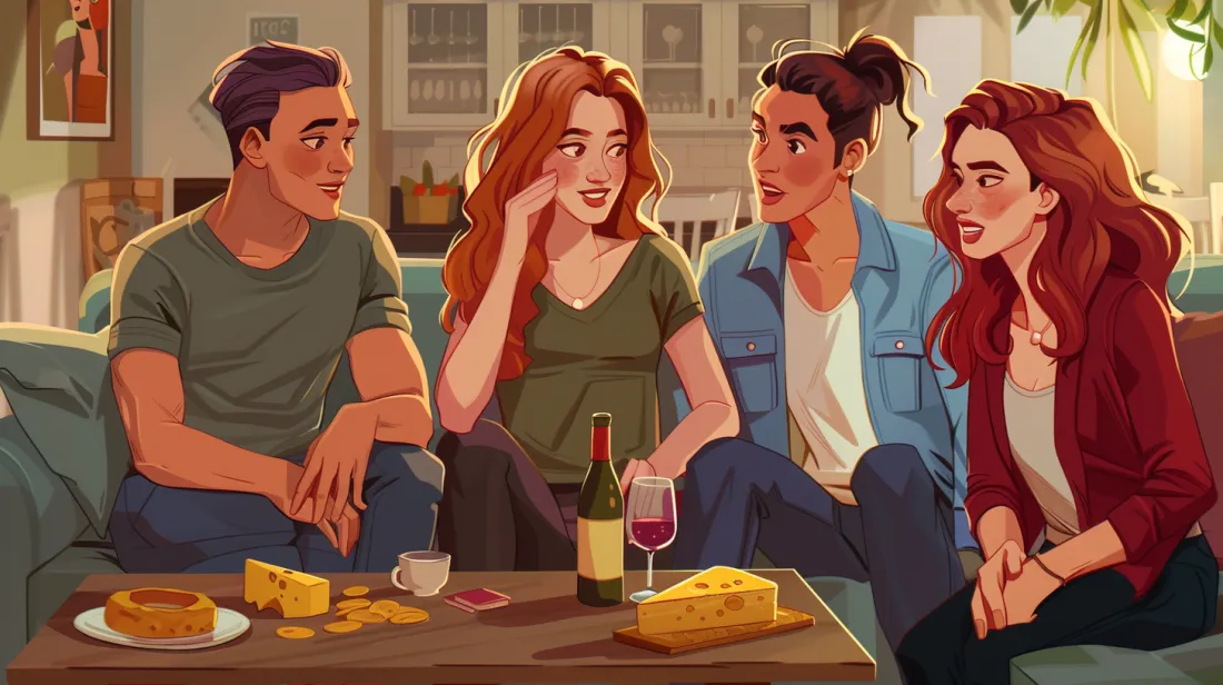 Mary looked at the clock on her kitchen wall, the second hand ticking away her anxiety. It was almost 7 PM, and her friends would be arriving soon for their monthly wine and game night. She glanced around her cozy apartment, making sure everything was perfect. The wine glasses were polished and arranged neatly on the coffee table next to an array of cheeses and crackers. The game of the night, "Trivial Pursuit," sat ready on the coffee table.