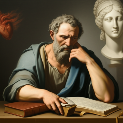 (Image: A detailed, intricate depiction of a cosmic spiral galaxy, its myriad stars and nebulae stretching into the vast unknown. In the foreground, subtle celestial light illuminates a solitary, contemplative figure, robed in ancient attire, gazing upwards with a mixture of awe and profound thought. The background suggests an infinite expanse of space, hinting at the boundless nature of the universe and the divine.)