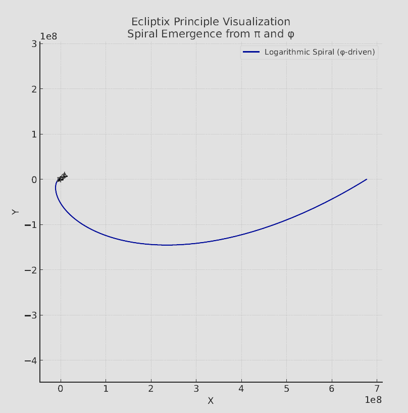 The provided text introduces "The Ecliptix Principle," a novel cosmological model proposing that dark matter and dark energy are not separate phenomena but rather emergent properties of the harmonic interplay between the mathematical constants pi (ฯ) and phi (ฯ). The author, Brent Antonson, suggests that the universe's observed expansion and gravitational anomalies result from the temporal deformation of ฯ-based recurrence into ฯ-driven logarithmic spirals. This framework reframes dark matter as a resonant artifact of golden-ratio geometry and dark energy as ฯ's asymptotic dominance over ฯ in a bounded system. The text further posits a metaphysical concept, the "quantum of relativity," which defines existence as the smallest possible unit of distinction between "nothing" and "something," suggesting that relativity is a foundational condition of the universe, preceding space and dimension.
