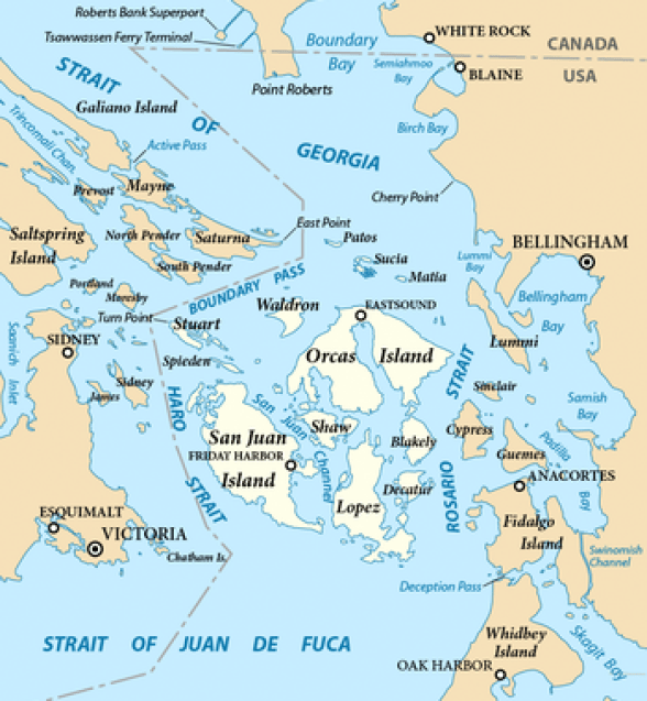 However, there are actually two straits that could be called the middle of the channel: Haro Strait, along the west side of the San Juan Islands; and Rosario Strait, along the east side.