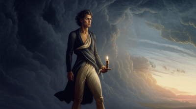 holding a scroll, observing two figures: one, a robust artisan freely crafting a vase with tools laid out before him, representing dignified labor; the other, a shadowed figure in chains, toiling under the gaze of an overseer, symbolizing forced slavery. The background subtly transitions from a sunlit, bustling marketplace to a darker, more oppressive landscape, illustrating the stark contrast and the complex philosophical relation between the two states of man.)
