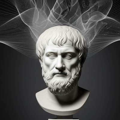 , while Aristotle points downwards, indicating his emphasis on observing particulars in the empirical world. The two figures stand in a thoughtful pose, symbolizing their distinct yet complementary approaches to understanding reality.)