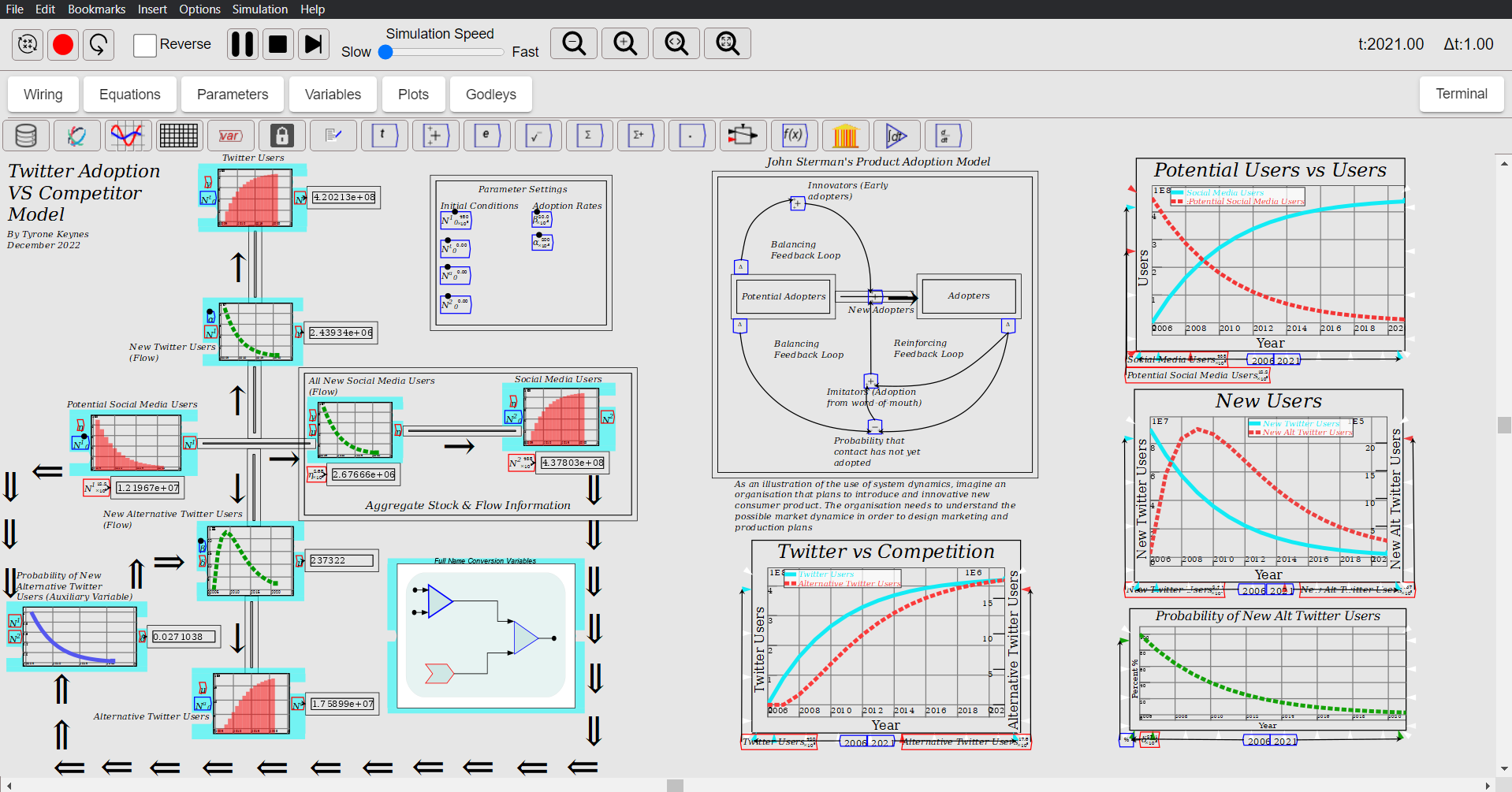 Using the software package called Minsky, I replicated John Sterman’s model, I started by doing some parameter adjustments to fit the user data of Twitter since 2006. I roughly set the innovation rate to the best of my ability and introduced competitors at the appropriate time, these being Post, Mastodon, etc.