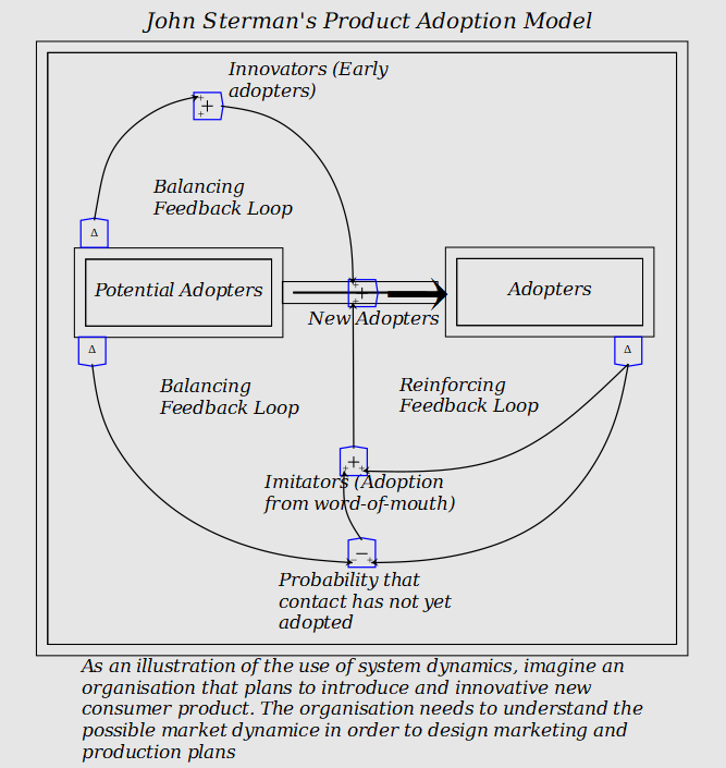 I’m finding many tweets about users leaving the platform for so-called greener pastures. No, not IG, or FB, as they don’t quite have the functionality of being a micro-blog site for many different reasons. Names like Mastodon, and Post come to mind as stated alternatives. This got me thinking, is there a way I could model this using system dynamics, and if so what would I discover? How do people adopt a product? How do these products go through innovation, and what comes along to imitate them? Fortunately, there is a man named John Sterman, that created the mathematical foundations around these thoughts called the Product Adoption Model. Basically, a new product is created, and in this case, it’s Twitter. Individuals start to participate or buy into this new product. Innovation is very high to start with, new ideas are endless, and as time progresses, we see the competition imitate this new product, and they will often bring their own innovations. However, like all things, nothing lasts forever. Innovation slows down, and the imitators cannibalize the other imitators.