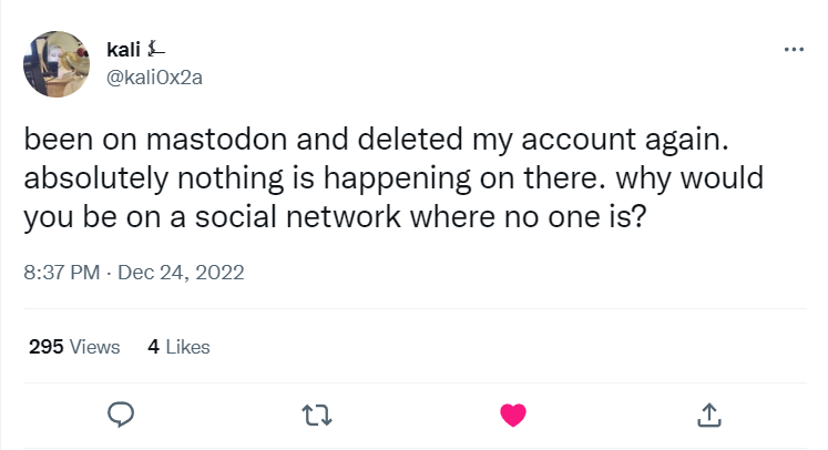 My findings in this simple model show that these alternatives probably don’t offer much of a threat to Twitter. After all, even though Twitter's user base is small compared to IG, FB, and YT, it still has around 340 million users. The alternatives that offer no real innovation collectively sit at the 15 million user mark. It seems the spoken sentiment in this area that I see goes like this, “I tried them, nobody was really there, and I felt like there was no deep engagement, so I came back to Twitter.”