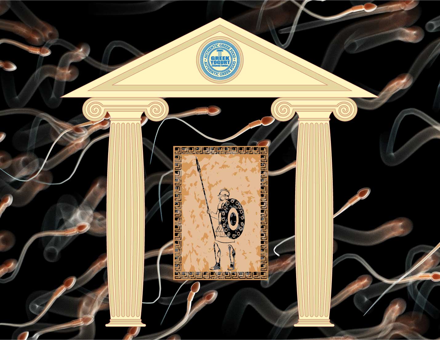 Greek pillars framed an Ancient Greek warrior, his resolute form set against a backdrop of abstract sperm, symbolizing the intertwining of cultural and biological evolution. This tableau, generation after generation, left the townsfolk in awe, feeling connected to something beyond the ordinary.