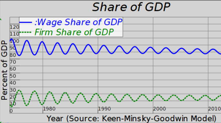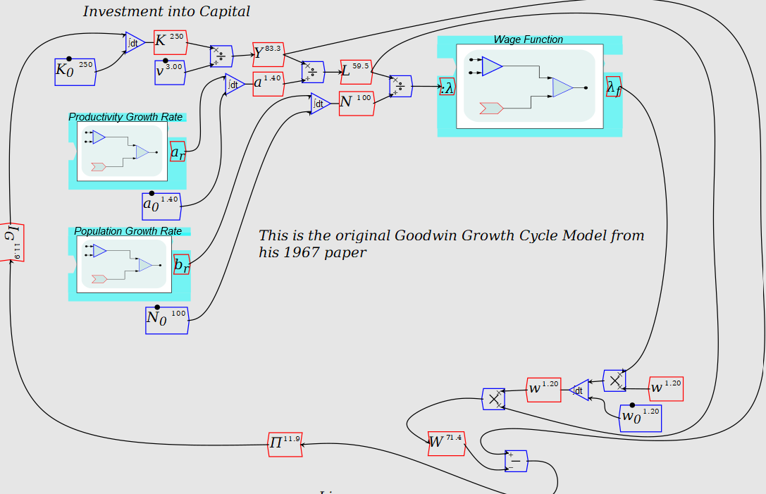 As a practitioner of System Dynamics, I tend to look under the hood of complex systems for feedback loops. The mode of behavior in the figure above exhibits an oscillation. It’s an indication of variables attracting and repelling one another. To take the hunch further, an experiment needs to be performed. One such experiment is the Goodwin Growth Cycle Model by Richard Goodwin in 1961. The model is based on the area of change over time using calculus. Without getting into mathematical equations, I will describe the model in the sense of its flow. Goodwin starts with a stock of capital divided by a capital-output ratio to define the output. He then defines productivity as a constant and divides output to get labor. The population in this model is held at a constant. Labour is divided by population to get an employment ratio; this is fed into a function that states if the employment ratio is above a certain level, wages rise. This creates a multiplier variable used to multiply a stock variable called wages. Wages are then multiplied by the labor variable to get total wages, and output minus total wages equals profits. In this simple model, all profits are invested into capital, completing the loop.